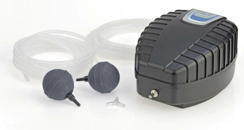 Set d’aération de bassin contenu dans une boîte étanche contre la pluie et toute projection d’eau.